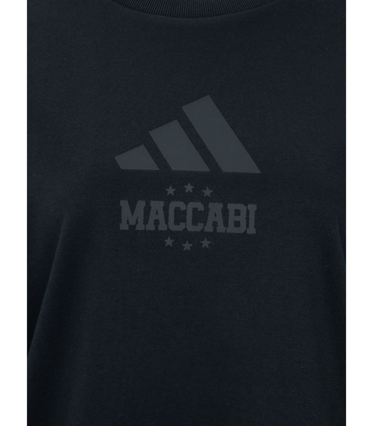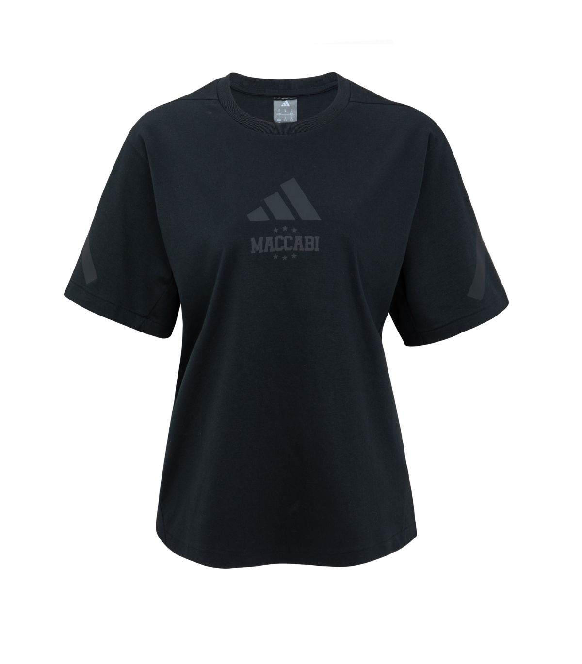 חולצת טישרט קצרה ADIDAS Z.N.E גזרת נשים בצבע שחור עם הכיתוב 'MACCABI' בעיצוב כוכבים.