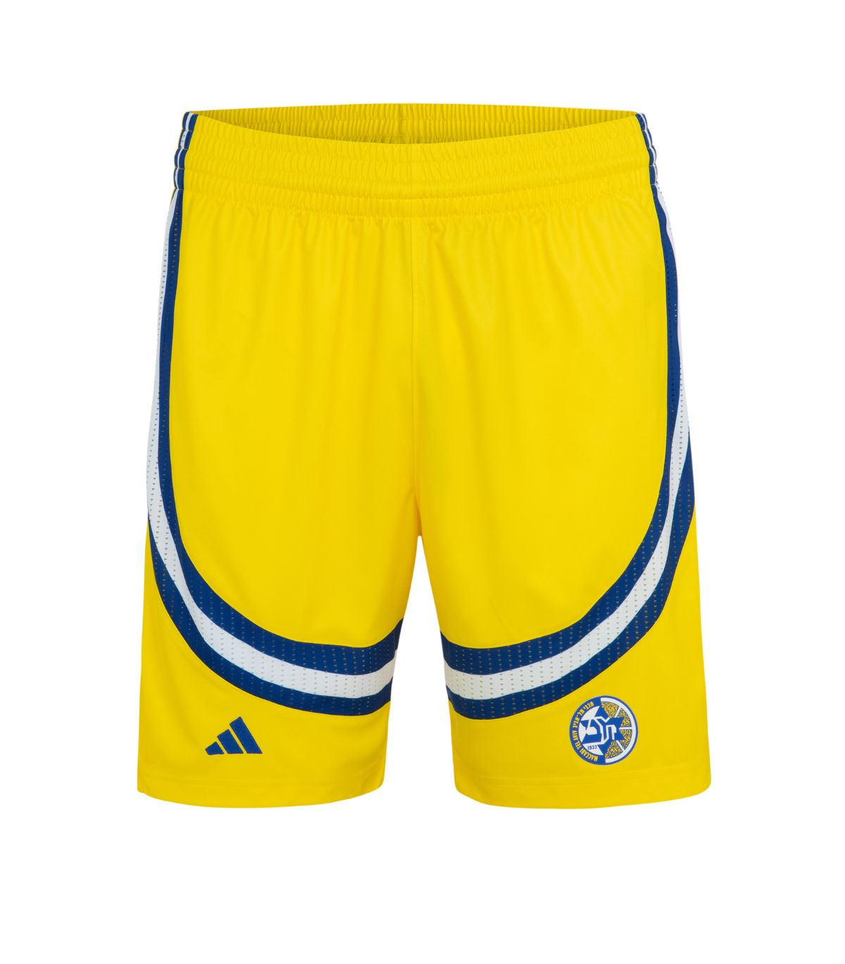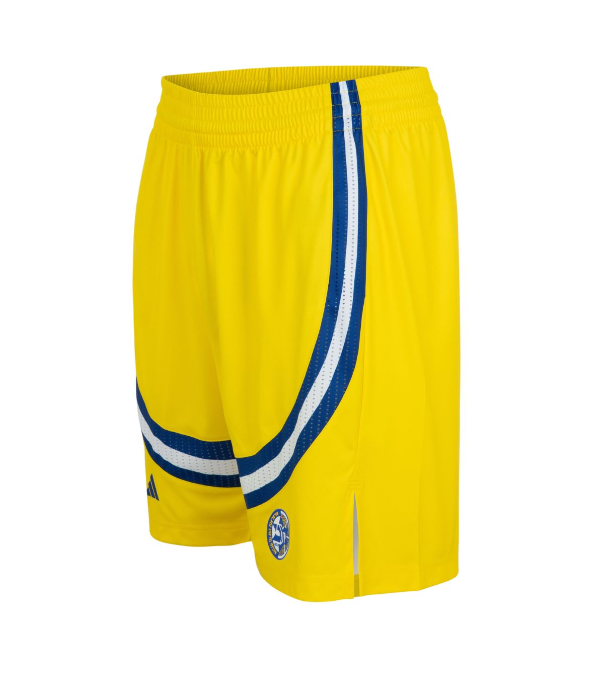 מכנסי משחק ADIDAS של מועדון הכדורסל מכבי תל אביב עונת 2025-26 למבוגרים בצבע צהוב.