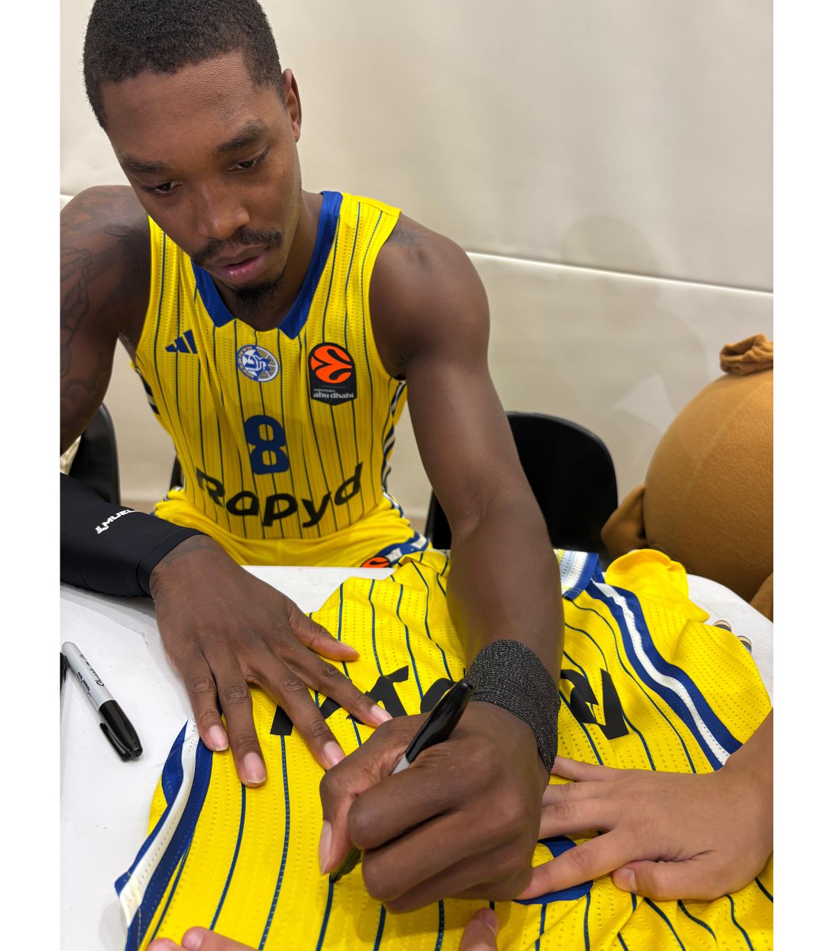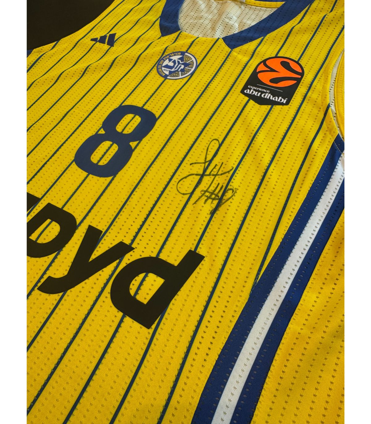 גופיה צהובה רשמית ADIDAS של מכבי "RAPYD" תל אביב לעונת 2025-26 חתומה על ידי לוני ווקר